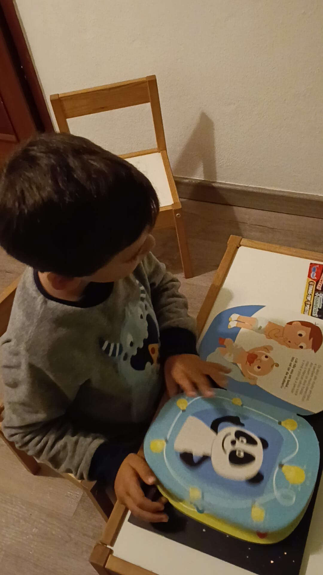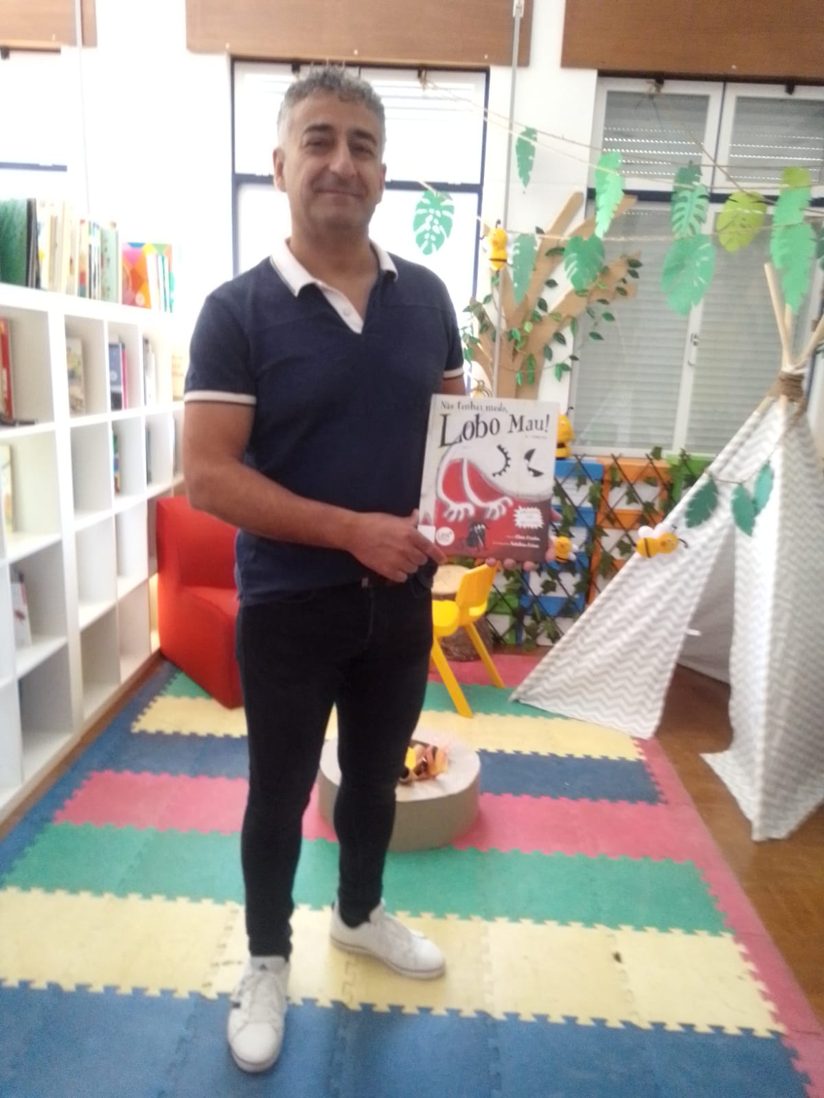Os alunos da sala 3 do Jardim de Infância vieram à biblioteca escolar para escolherem os livros que vão ler em casa com a família. Aqui temos o Vitor Hugo.